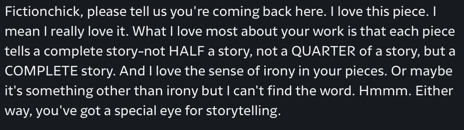 I’ve since revised TNP—the original was laced with curse words and had a married MC who falls in love with a pirate, both of which are things that didn’t bother the online fiction folks at all, but really seemed to rub the book readers wrong. (The MC is still married. Fair warning.) Still, every once in a while someone finds it and loves it, and it will forever be the story that brought me back to fiction writing.